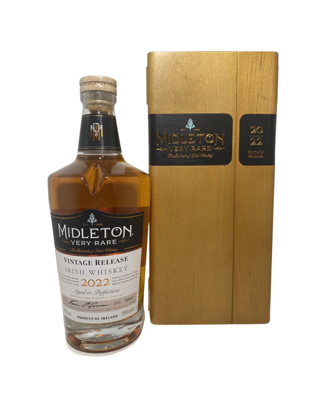 The 2022 edition to Ireland's most premium and beloved whiskey series; Midleton Very Rare. This is the 39th installment and the first release under Kevin O' Gorman appointed Master Distiller of the Midleton Distillery in 2020. Both the bottle and gift box are in very good condition, certificate and distillery invite are also included. Bottle number 2843