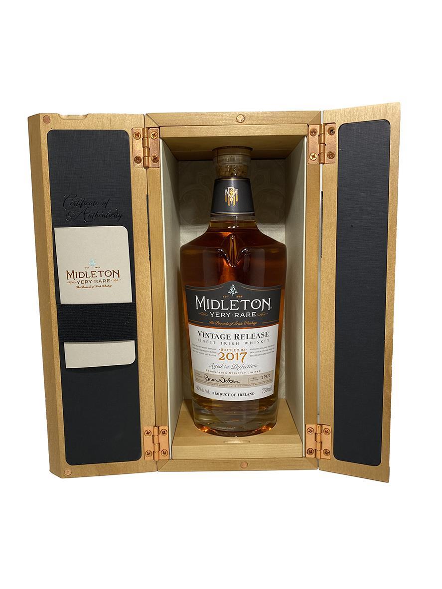 The Midleton Very Rare 2017, is a bottling brought out by the Midleton Distillery in Co. Cork. The ‘Midleton Very Rare’ range was launched in 1984 and a new vintage has been released every year since then. Barry Crockett started off the ‘Midleton Very Rare’ range while he was the Master Distiller of Midleton Distillery, in 2013 Barry Crockett retired from his role of Master Distiller. From 2014 onwards Brian Nation has been creating the ‘Midleton Very Rare’ range, maintaining its role as standard-bearer and pinnacle of Irish Whiskey. The bottle and gift box in great condition also include the cert and distillery invite. New bottle style and label. Bottle number 27970