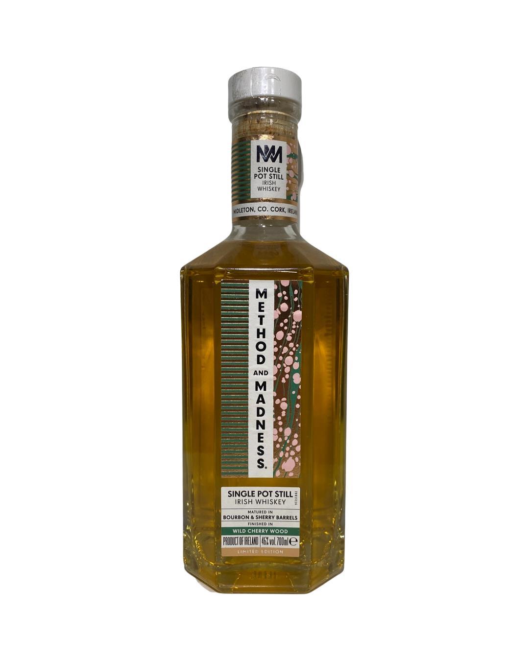 A Method and Madness Single Pot Still Irish Whiskey finished in Wild Cherry Wood. A brave and exciting new approach to whiskey maturation, it marks the first time that a single pot still Irish whiskey has been finished in nine wild cherry wood casks. A bold and fresh whiskey with plenty of complexity and spice.Launched in 2017, the Method and Madness range of whiskeys (and gin) aims push the boundaries of traditional spirit-making, combining both time-honored methods and daring approaches.