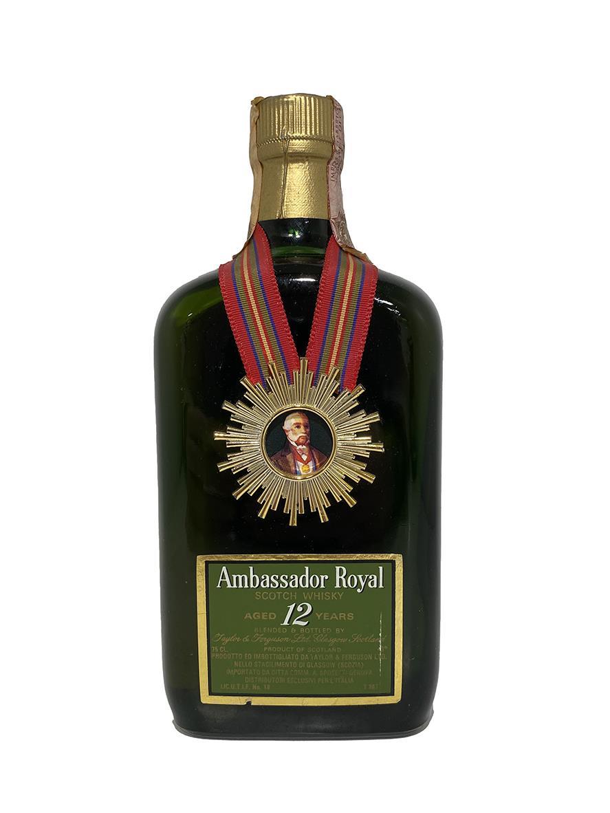 A bottle of Taylor & Ferguson's Ambassador Royal 12 Year Old blended Scotch whisky. This was bottled for the Italian market and imported by Pedro Domecq, This is presumed to be from the 1970s.