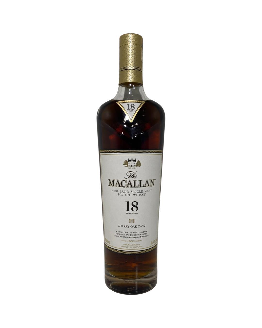 This Macallan 18 Year Old Sherry Oak 2021 Release is a part of the Sherry Oak collection which focuses exclusively on Single Malts aged in rich sherry casks. These hand-selected seasoned oak casks are chosen from the Jerez region for the complexity and warmth that they add to the liquid. This is a full-bodied single malt, spicy and warm on the nose with citrus and ginger on the finish. Not to be missed!