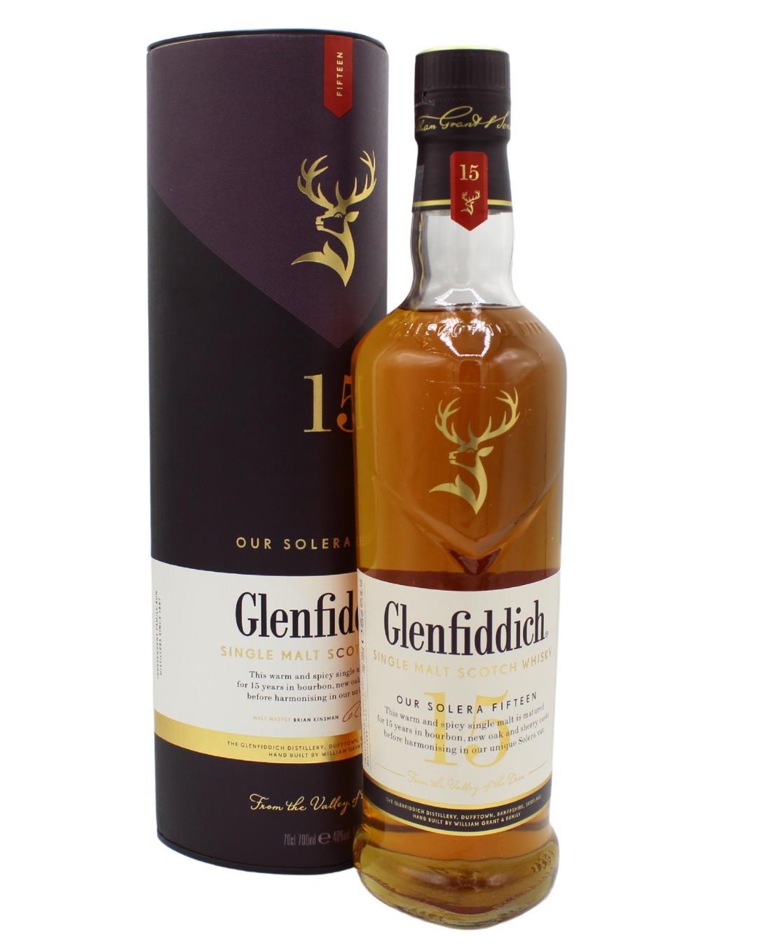 The Glenfiddich 15 Year Old is a uniquely aged single malt that has been aged in European, American and fresh American oak before going into a 'Solera System' similar to those used for the ageing of quality Sherry. Once aged the whisky is married for a further period in Portuguese oak tuns.