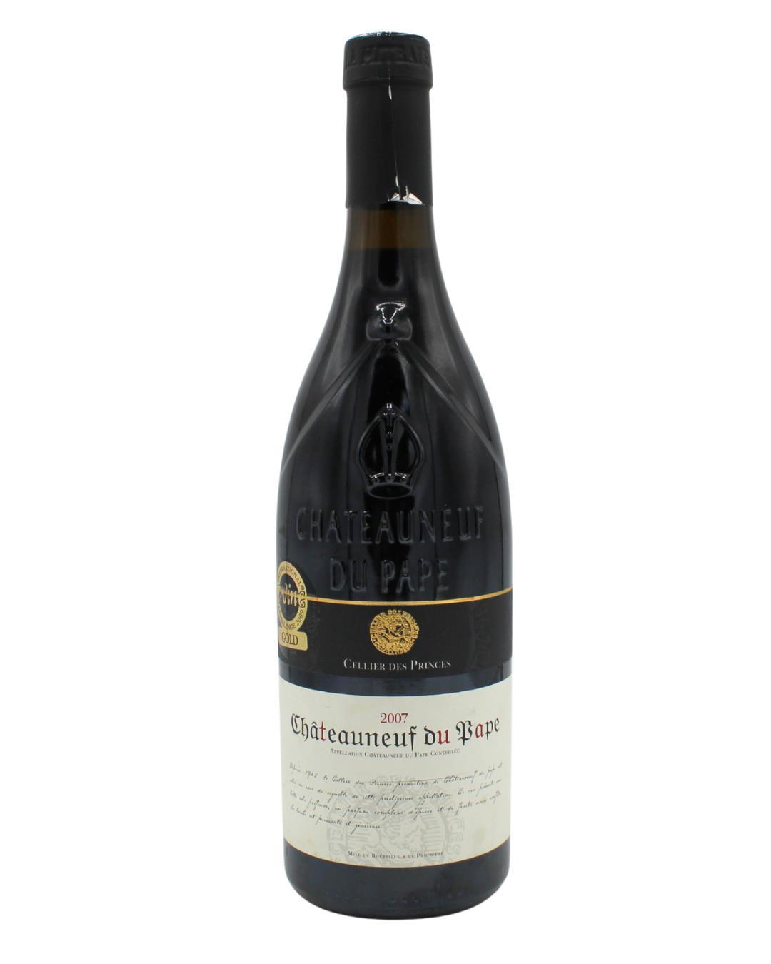 A bottle of 2007 Cellier des Princes Chateauneuf-du-Pape. Crunchy redcurrant and raspberry fruit upfront, with vibrant, lifted flavours that carry through the palate. The finish is long and zesty, marked by a distinctive lemony freshness that adds brightness and balance. Please note: We make no guarantee regarding the quality or drinkability of this wine. As we cannot verify prior storage conditions.