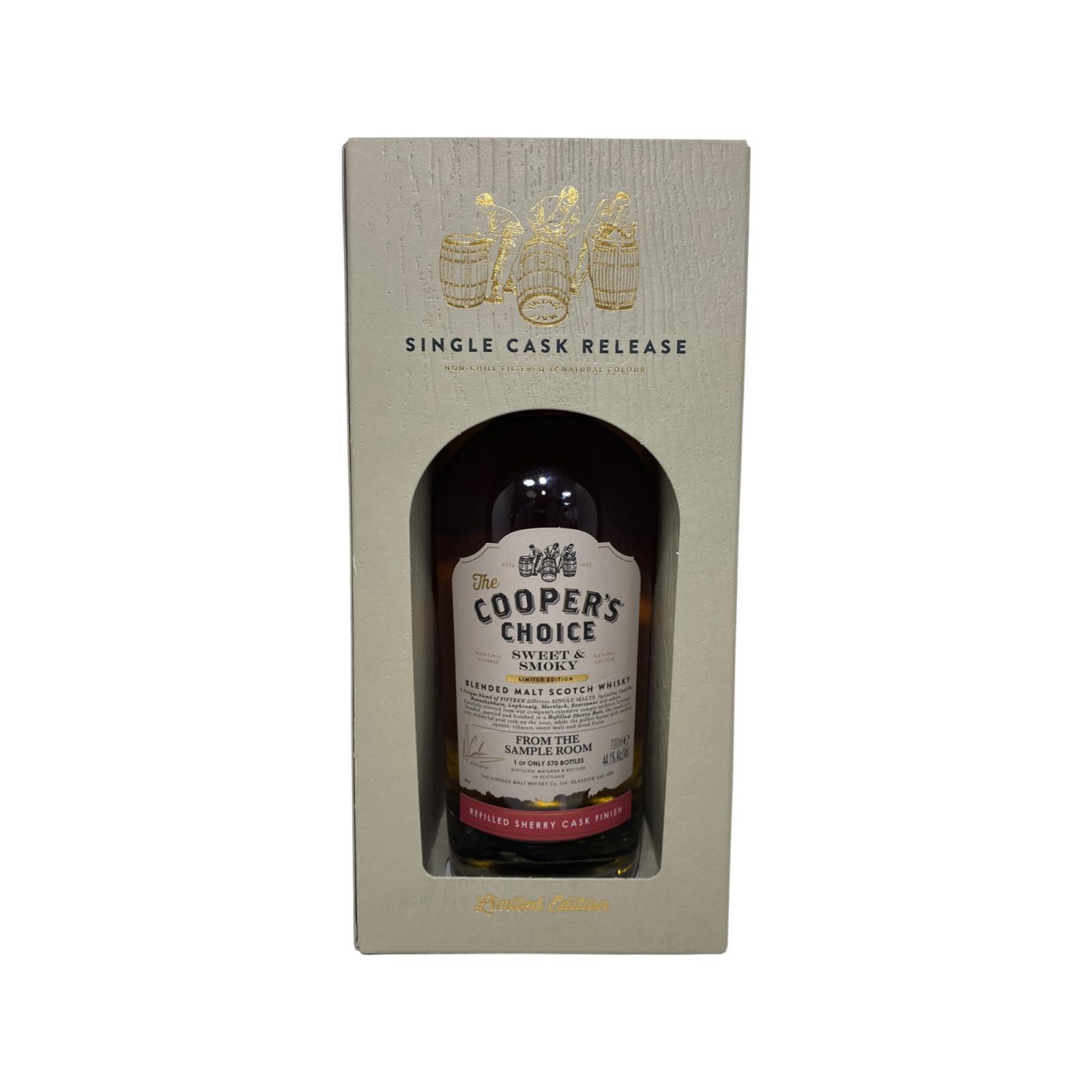 The Cooper’s Choice From The Sample Room Sweet & Smoky Refilled Sherry Cask Finish is a blended malt made from 15 malts including Caol Ila, Bunnahabhain, Laphroaig, Mortlach and Benrinnes and bottled by the independent bottler Cooper’s Choice (Vintage Malt Whisky Company). This From The Sample Room release matured in a refill sherry cask and was bottled in 2021 at 44,1% ABV, non chill filtered and with no added colour, a limited edition of 570 bottles were made.
