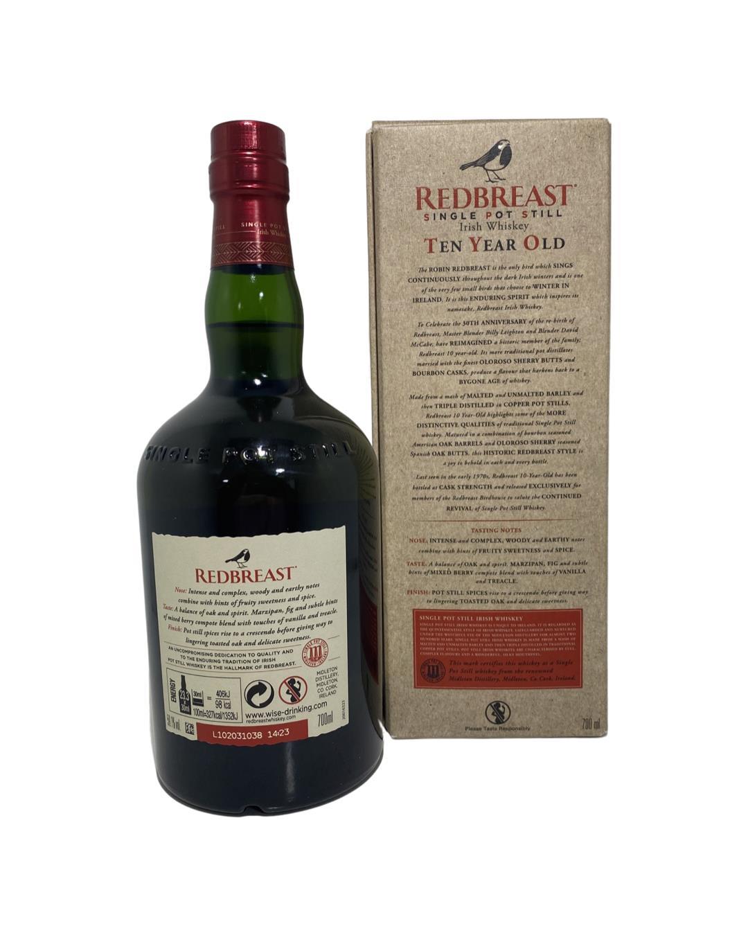 Launched to celebrate the 30th anniversary of the revival of the Redbreast brand, Redbreast 10 was resurrected. Made from a mash of malted and unmalted barley and then triple distilled in copper pot stills, Redbreast 10-Year-Old highlights some of the more distinctive qualities of traditional Single Pot Still whiskey. Matured in a combination of bourbon seasoned American oak barrels and oloroso sherry-seasoned Spanish oak butts, this historic redbreast style is a joy to behold in each and every bottle. Both the bottle and gift box are in very good condition.