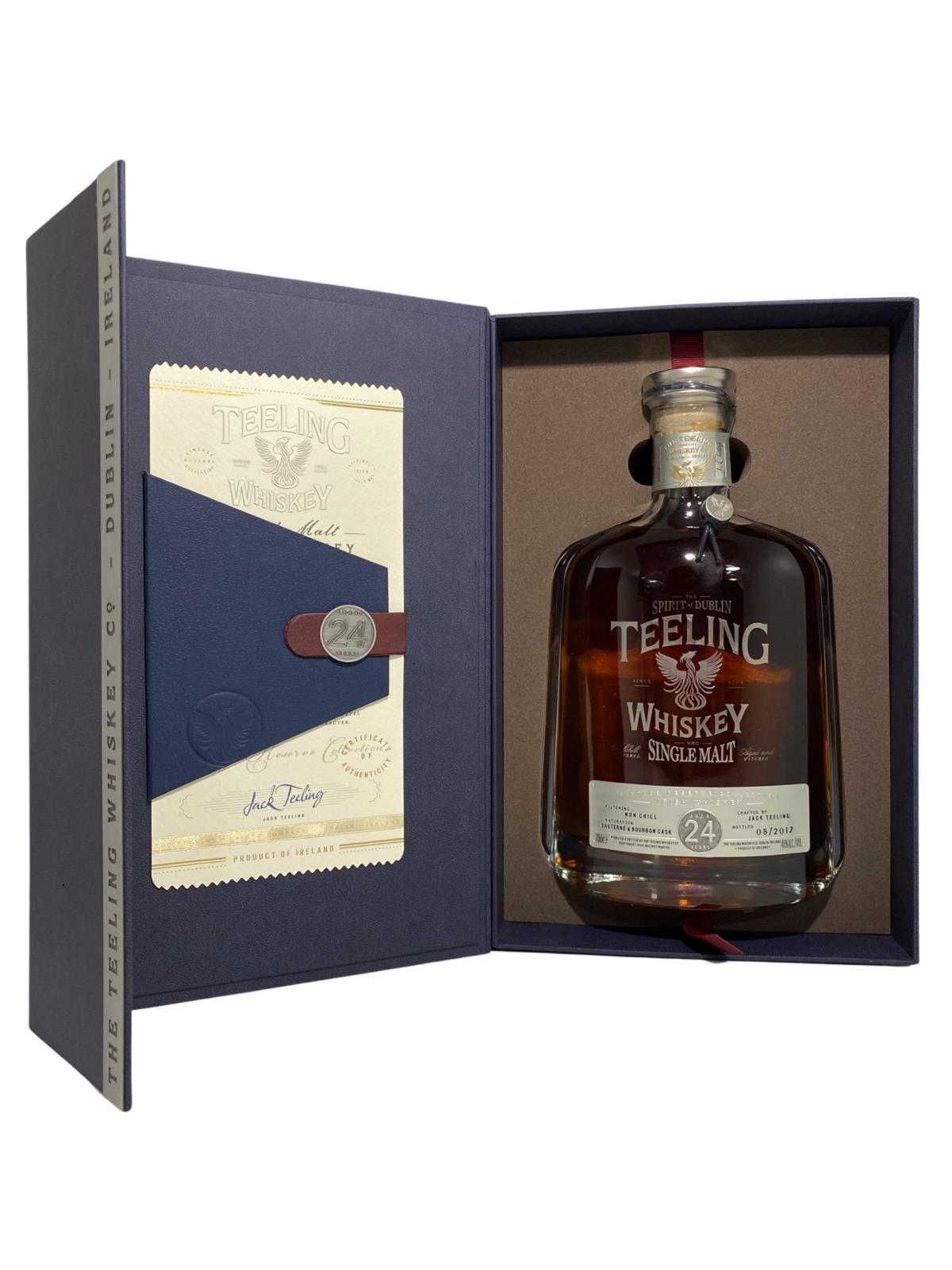 The Teeling 24 Year Old Single Malt Irish Whiskey was first distilled in 1991 and matured in Bourbon casks then allowed marry in Sauternes wine casks producing a wholly unique taste experience. The unique dual maturation imparts an extra depth of fruit flavours that perfectly complement the hint of smoke derived from the inclusion of a small portion of Peated malt as part of the original ingredients used in production. This small batch bottling, limited to just 5,000 70cl bottles, were hand bottled in unique decanter bottles and come with their own certificate of authenticity.