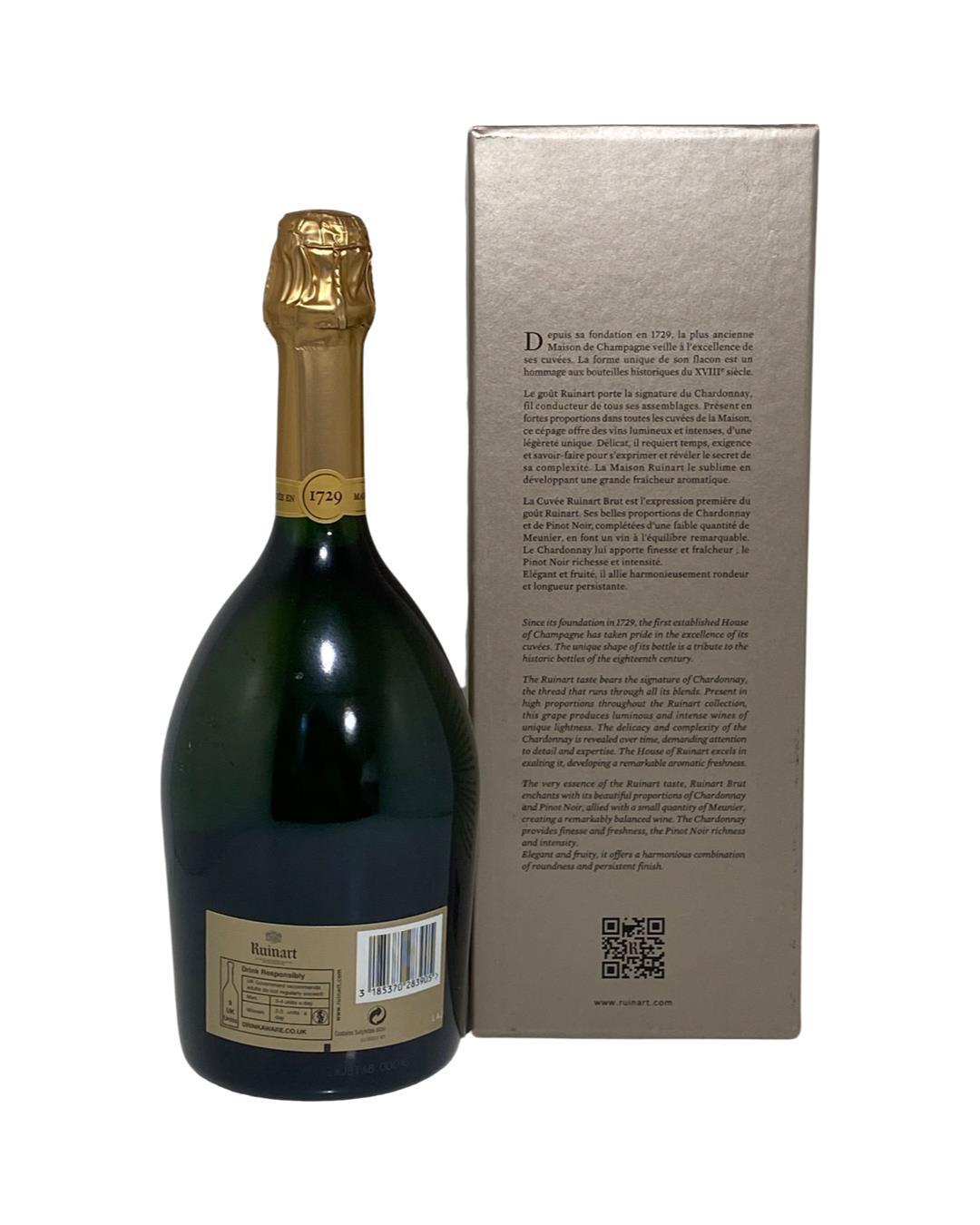 Ruinart Brut is a harmonious champagne, produced from a blend of pinot noir (40–45%), meunier (10–15%) and fresh chardonnay (40%). Created from 40–50 different crus from the terroirs of Côte des Blancs and Montagne de Reims.
