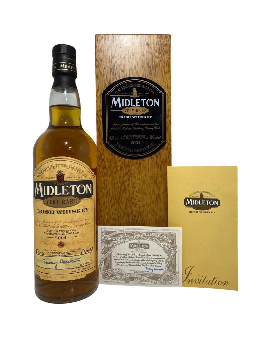 The Midleton Very Rare 2004, is a bottling brought out by the Midleton Distillery in Co. Cork. The ‘Midleton Very Rare’ range was launched in 1984 and a new vintage has been released every year since then. Barry Crockett started off the ‘Midleton Very Rare’ range while he was the Master Distiller of Midleton Distillery, The bottle and box are in excellent condition and include the distillery invite and certificate.The Midleton Very Rare range of whiskeys is a collection of highly regarded Irish whiskeys crafted at the Midleton Distillery in County Cork, Ireland. With a reputation for excellence, these whiskeys are known for their exceptional quality, craftsmanship, and limited availability. Characterized by smoothness, complexity, and depth of flavour, Midleton Very Rare often exhibits notes of ripe fruits, honey, vanilla, spices, and oak. The component casks are typically aged for around 12-27 years but each yearly batch is unique and for this reason the whiskeys are highly collectible. To this day the Midleton Very Rare series is still regarded as the pinnacle and benchmark for ultra-premium blended Irish whiskeys.