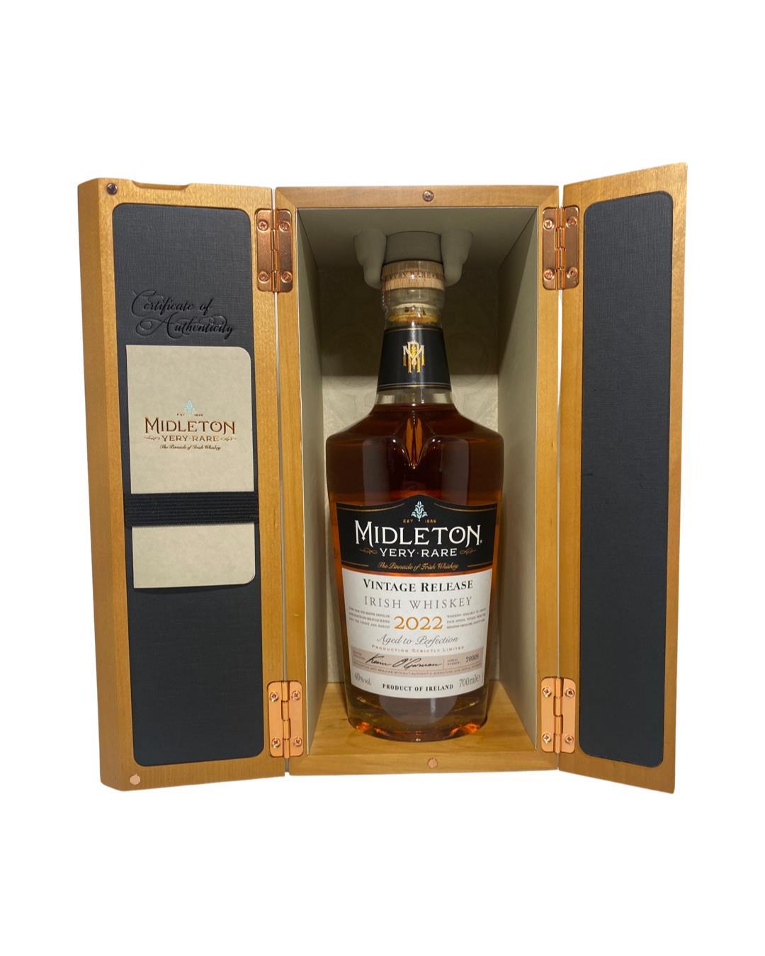 The 2022 edition to Ireland's most premium and beloved whiskey series; Midleton Very Rare. This is the 39th installment and the first release under Kevin O' Gorman appointed Master Distiller of the Midleton Distillery in 2020. Both the bottle and gift box are in very good condition, certificate and distillery invite are also included.  The Midleton Very Rare range of whiskeys is a collection of highly regarded Irish whiskeys crafted at the Midleton Distillery in County Cork, Ireland. With a reputation for excellence, these whiskeys are known for their exceptional quality, craftsmanship, and limited availability. Characterized by smoothness, complexity, and depth of flavour, Midleton Very Rare often exhibits notes of ripe fruits, honey, vanilla, spices, and oak. The component casks are typically aged for around 12-27 years but each yearly batch is unique and for this reason the whiskeys are highly collectible. To this day the Midleton Very Rare series is still regarded as the pinnacle and benchmark for ultra-premium blended Irish whiskeys.