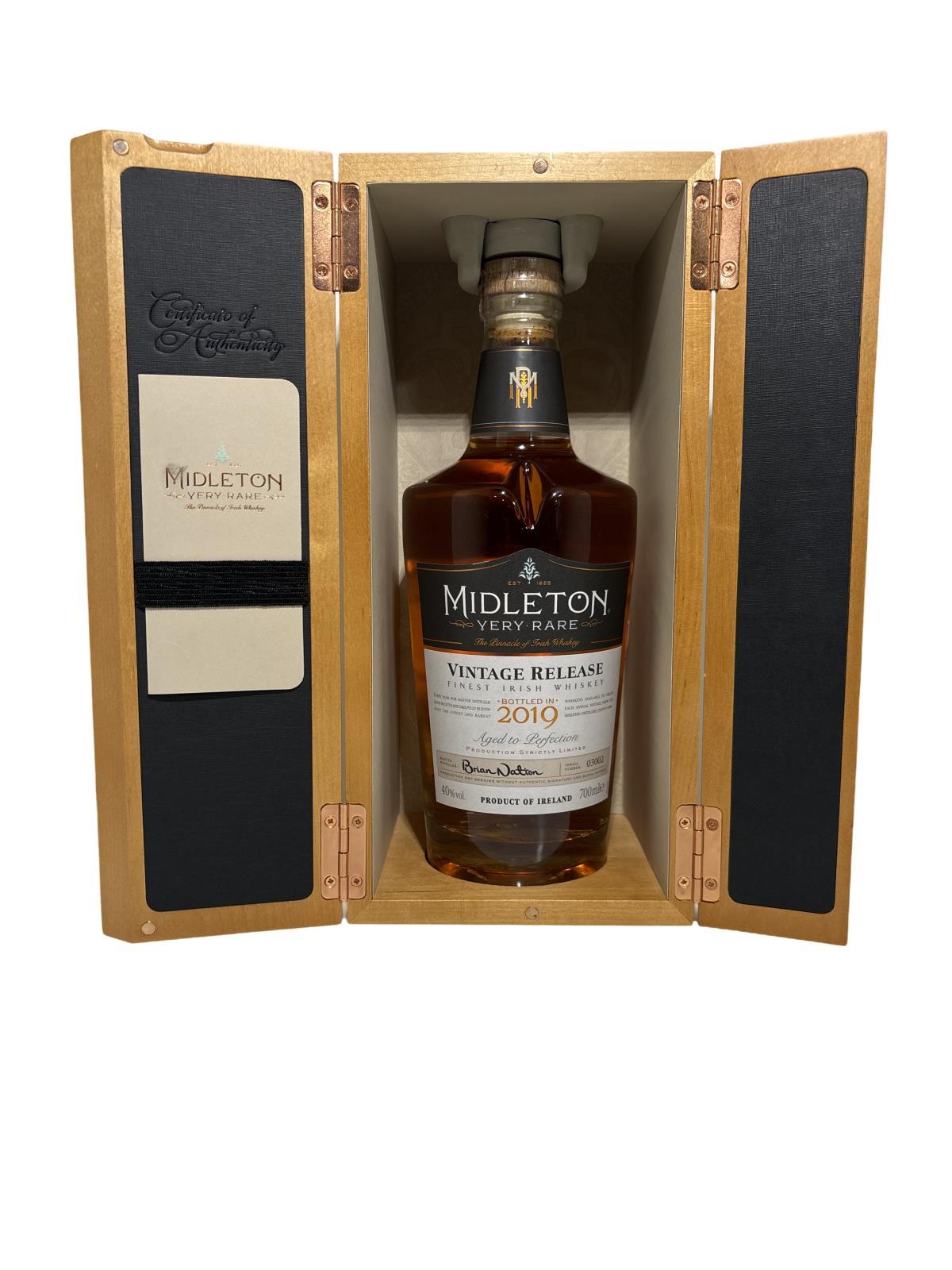 The Midleton Very Rare 2019, is a bottling brought out by the Midleton Distillery in Co. Cork. The ‘Midleton Very Rare’ range was launched in 1984 and a new vintage has been released every year since then. Barry Crockett started off the ‘Midleton Very Rare’ range while he was the Master Distiller of Midleton Distillery, in 2013 Barry Crockett retired from his role of Master Distiller. From 2014 onwards Brian Nation has been creating the ‘Midleton Very Rare’ range, maintaining its role as standard-bearer and pinnacle of Irish Whiskey. The bottle and gift box in great condition also include the cert and distillery invite.