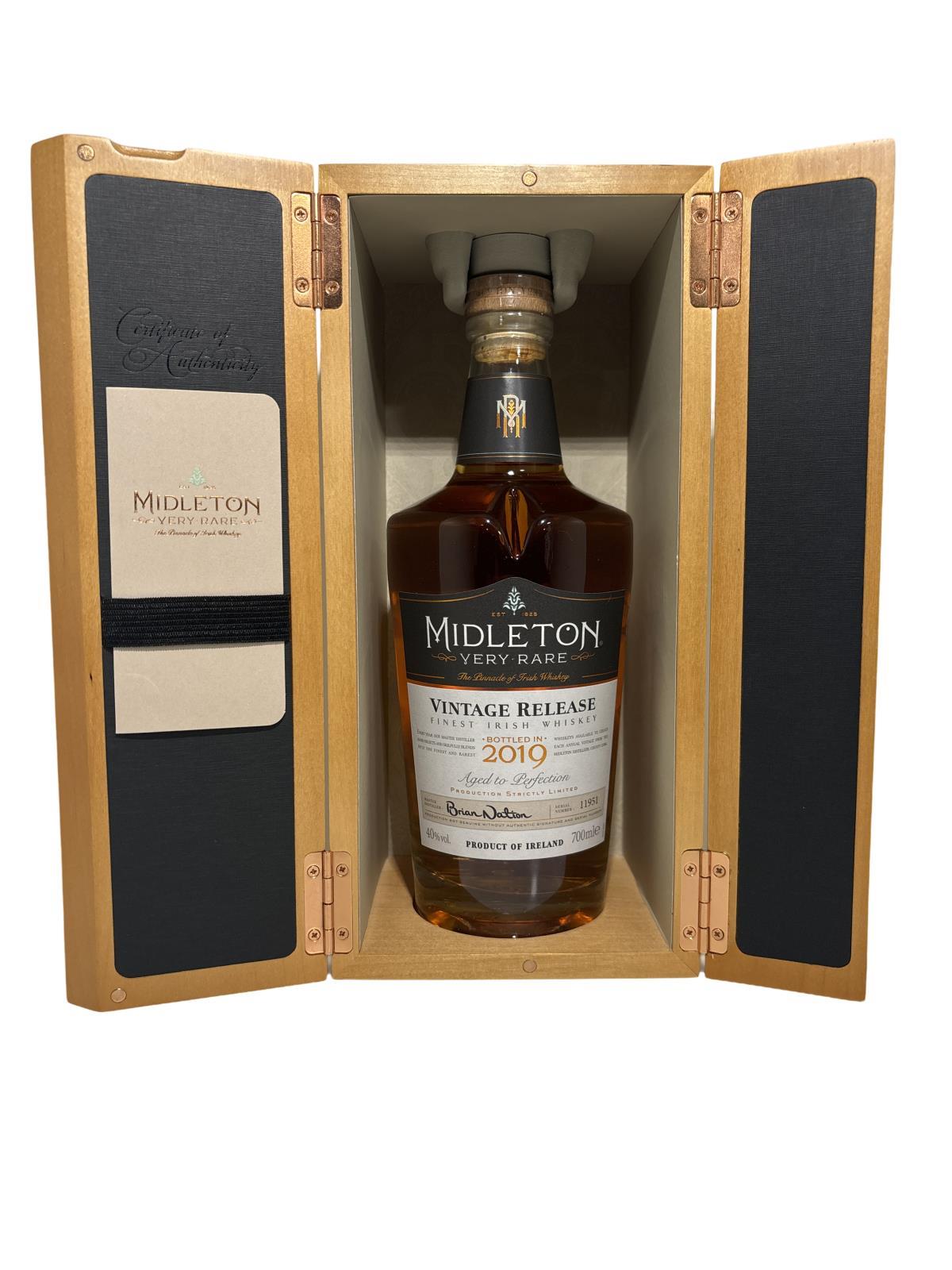 The Midleton Very Rare 2019, is a bottling brought out by the Midleton Distillery in Co. Cork. The ‘Midleton Very Rare’ range was launched in 1984 and a new vintage has been released every year since then. Barry Crockett started off the ‘Midleton Very Rare’ range while he was the Master Distiller of Midleton Distillery, in 2013 Barry Crockett retired from his role of Master Distiller. From 2014 onwards Brian Nation has been creating the ‘Midleton Very Rare’ range, maintaining its role as standard-bearer and pinnacle of Irish Whiskey. The bottle and gift box in great condition also include the cert and distillery invite.