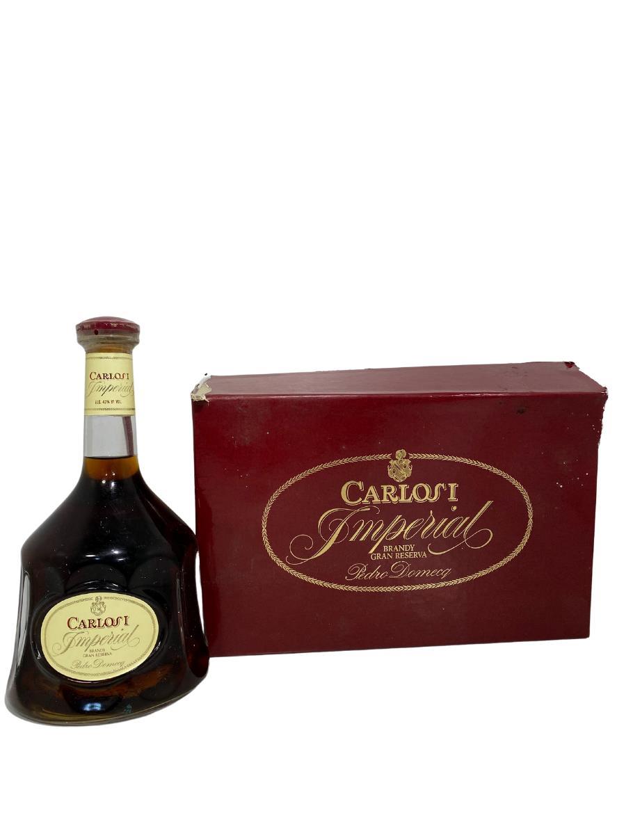 A very long-aged traditional Spanish grape brandy from the Jerez region, more famous for its fortified wine. Carlos, I Imperial has been aged in a solera system, just like the sherry itself. This is an old bottling and the box is damaged as can be seen in the photos.