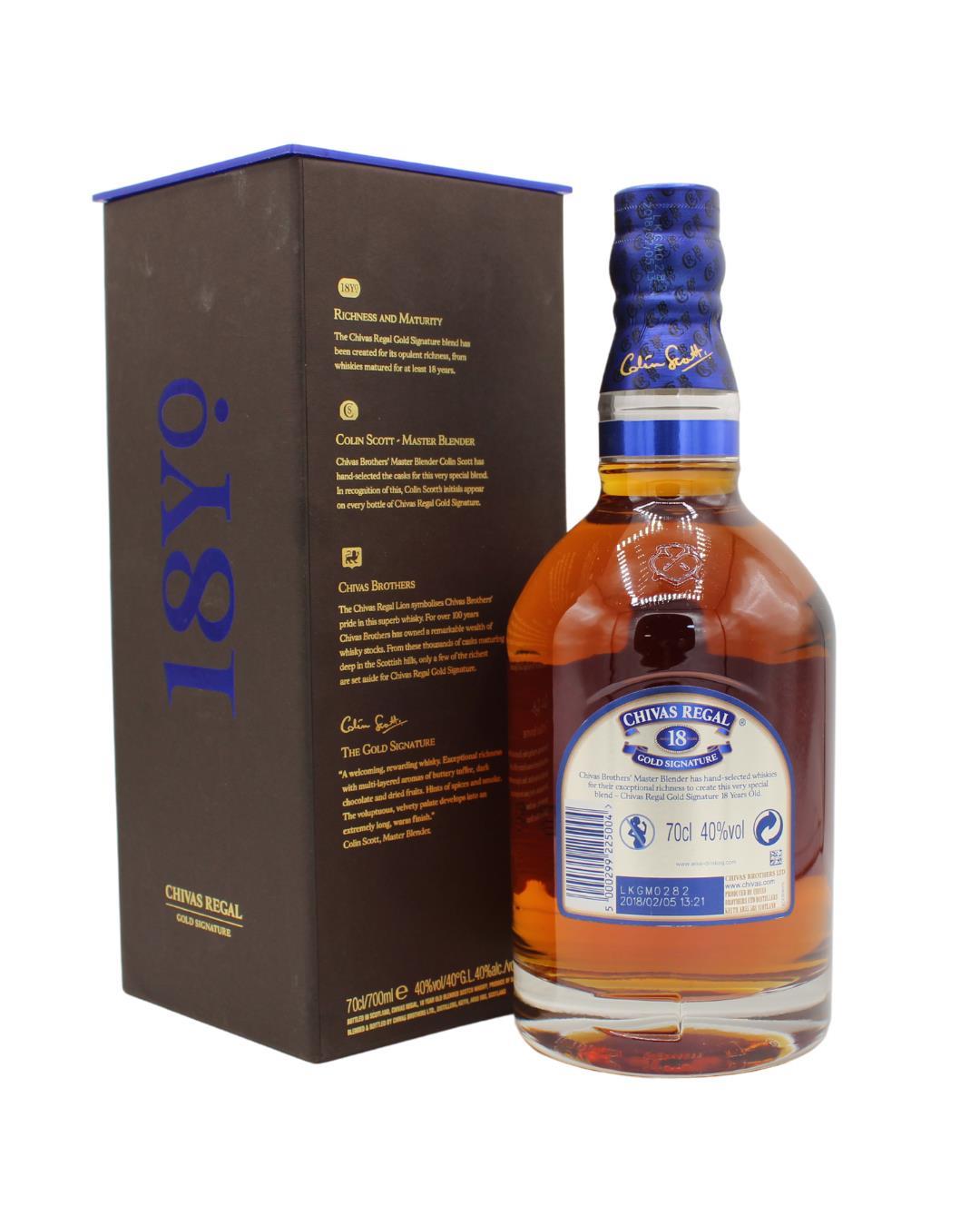 Chivas 18 Year Old is an award-winning blended scotch whisky. Chivas 18 Year Old is a uniquely rich and multi-layered blend that includes over twenty of Scotland's rarest single malt Scotch whiskies. If you know Chivas Regal 18, you'll know some things can't be simplified. You'll know the refined and complex blend of 85 flavour notes in every measure of whisky is 18 years in the making. Velvety, luxurious, dark chocolate cues and multi-layered aromas of dried fruit and buttery toffee.