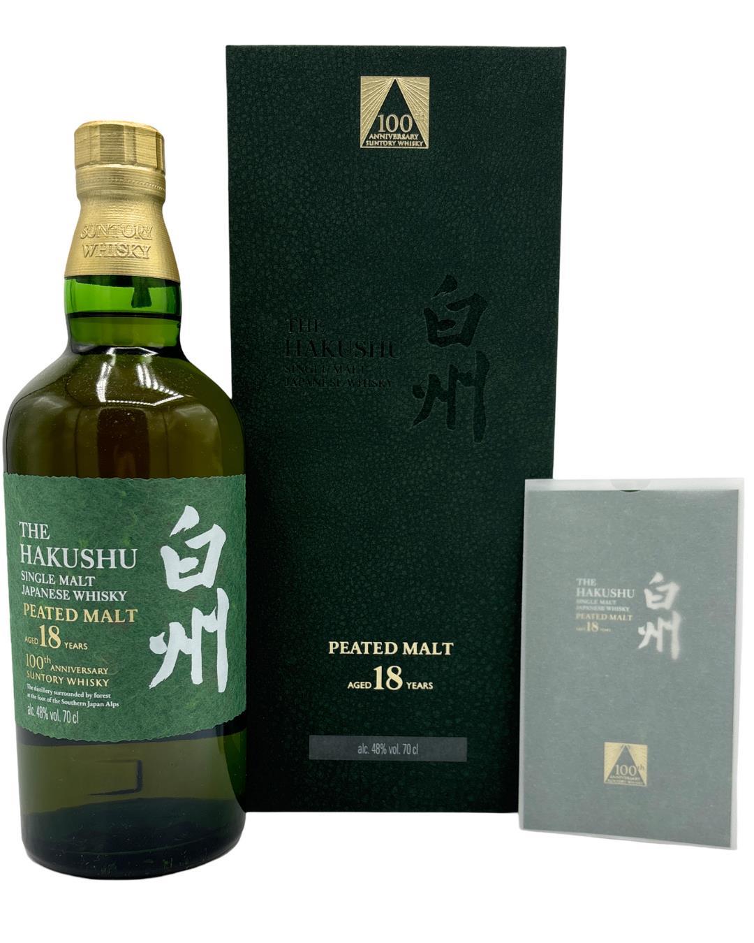 Bottled for the 100th Anniversary of the distillery, The Hakushu 18 Peated Malt is an extremely limited-edition whisky made of carefully selected malt whiskies all aged for a minimum of 18 years in various casks, created in honor of Suntory Whisky's centenary. The Hakushu Distillery blenders work with peat, while softening the palate using the exceptional mountain water of the area, filtered through ancient granite rocks. Refined and elegant, this centennial Hakushu Peated Malt brings smoke that is less strong, never dominant and in typical Japanese style, complex and gentle.