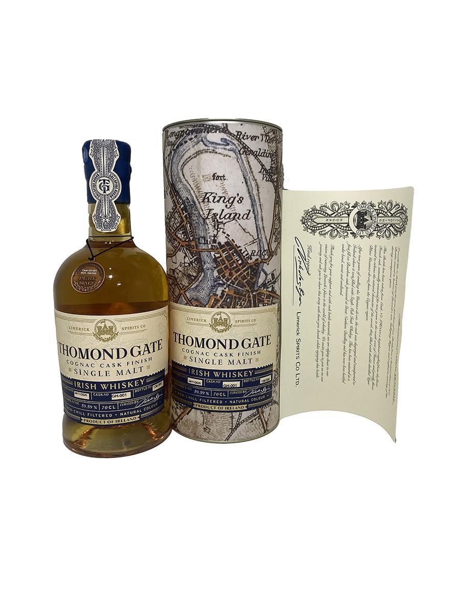 The second new release from Thomond Gate Whiskey as part of its ‘Departed Spirits of Limerick’ series, pays homage to a rebellious hero known as Galloping Hogan, from the parish of Doon, Co Limerick. In memory of Galloping Hogan and the French involvement in the siege of Limerick, this is a Single Malt Irish Whiskey, finished in a French Cognac cask. This gives the whiskey a warming spice, with gentle vanilla, brown sugar, and biscuit taste with a hint of dried flowers, green apples, and orchard fruits. A limited release of just 300 bottles. This is bottle 139. The bottle and gift tube are in excellent condition.
