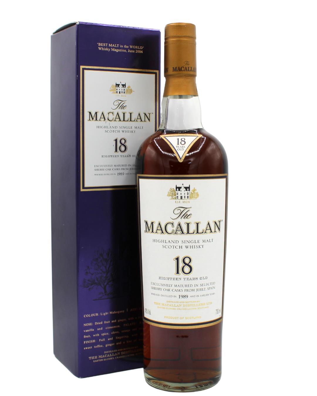 The Macallan 18 year old Speyside single malt distilled in 1989 and laid down at The Macallan distillery, was exclusively matured for more than 18 years in sherry wood casks from Jerez, Spain, before being bottled in 2007. The Macallan Distillery, located in Craigellachie, Scotland, is renowned for its exceptional single malt Scotch whiskies with a strong tradition of maturation in quality Sherry casks. A rich history dating back to 1824, Macallan has established itself as a symbol of luxury and craftsmanship. Nestled within the beautiful Speyside region, the distillery's stunning architectural design seamlessly blends with the surrounding landscape. Its unique production process combines traditional methods with cutting-edge technology, resulting in whiskies of unparalleled quality. ‘The Macallan’ stands as a symbol of excellence in the whisky world. Its whiskies are known for their complexity, craftsmanship, and attention to detail. From their core expressions to exclusive releases, Macallan continues to captivate whisky connoisseurs and collectors with its exceptional range of single malt Scotch whiskies.