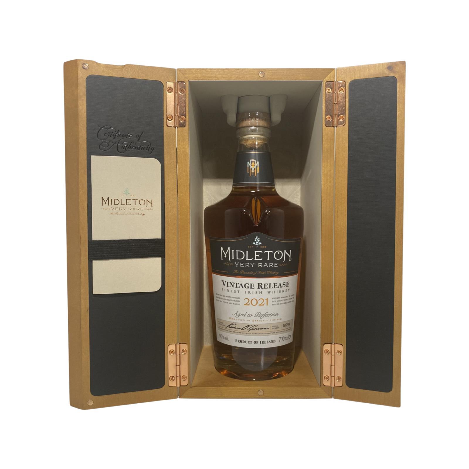 The 2021 edition to Ireland's most premium and beloved whiskey series; Midleton Very Rare. This is the 38th installment and the first release under Kevin O' Gorman appointed Master Distiller of the Midleton Distillery in 2020. Both the bottle and gift box are in very good condition, certificate and distillery invite are also included. Bottle number 10799