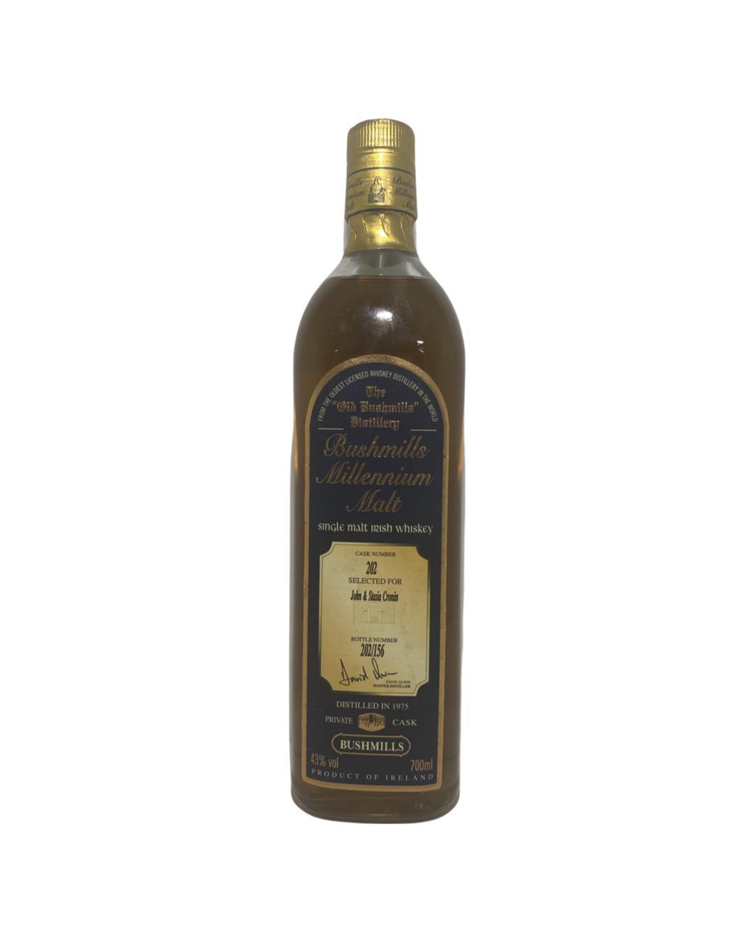 This bottle of Bushmills Millennium Single Malt was bottled around the Millennium and what resulted was the longest aged Bushmills whiskey available then, with this exceptional cask being 202.Bushmills Millennium Malt is a series of single cask bottlings from whiskey distilled in 1975 and matured in ex-Bourbon barrels. This unique Bushmills Millennium Malt has come straight from the cask, pure and unfiltered, following the ancient tradition that is whiskey making in Ireland. The addition of water, which flows over the basalt rock from St. Columbs Rill, to bring it to its bottled strength, is the only change Bushmills have made to your whiskey since it began the slow gentle process of maturation in your cask, back in 1975.